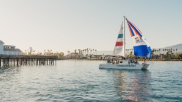 The view is better from the water! Our 50 ft sailing Catamaran, The Double Dolphin, casts off almost daily for coastal cruises, Music on the Water cruises, and more. Her 1400 square feet of deck space and dual-hull construction make her comfortable, stable, and safe.